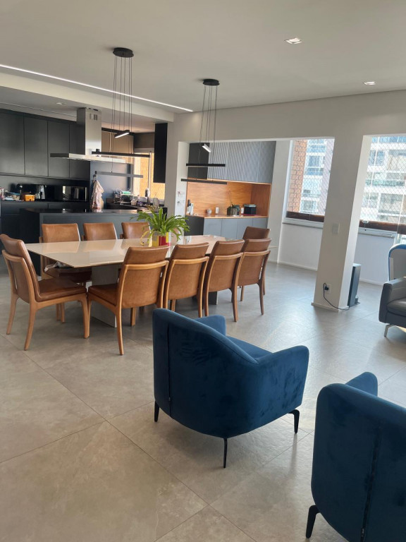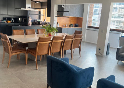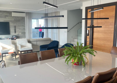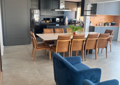 A total integração da cozinha com as salas e o lazer de piscina, churrasqueira e bar, torna ainda mais agradável a arte de receber e o prazer cotidianos.
