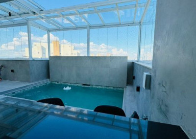 Note que, na área externa, o deck da piscina e o teto de vidro são retráteis.